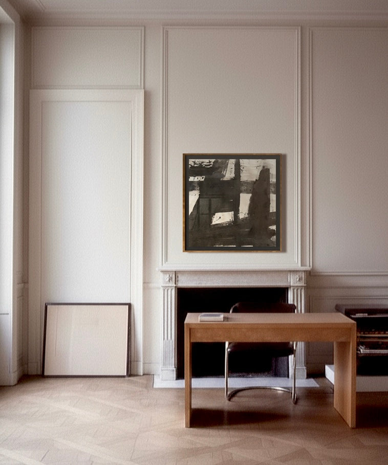 Original painting by contemporary Swedish artist Nicolas Makelberge. Ink and charcoal on raw canvas, mounted on black passepartout and framed behind glass in custom-made waxed oak frame. Signed and dated by the artist. Certificate of authenticity included.